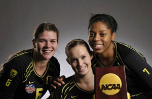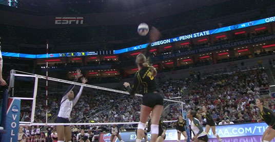 As they have all tournament, Oregon came out firing all guns in the second set, and pulled away 8-3 in the early going. The Ducks played stellar defense all match and finally settled down, making better attacking decisions. With the score 16-9 it was all Oregon, and Penn State suffered a setback from which they never fully recovered, when their star setter, Micha Hancock, rolled her ankle and favored it for the rest of the match. The Ducks built a ten point lead, but squandered it and allowed Penn St. to get back into the set and tie.