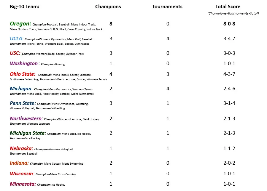 Are Our Beloved Ducks the No. 1 program in all of Big-10 (B1G) sports? I had checked into this during the spring, and later heard we did well, but I wanted to investigate and report to my Duck-Buddies who read this site, and chat in the forum for us all to enjoy. I actually had to take a break from my gaming fun at JackpotCity in New Zealand as it was quite the task to gather the information, and organize it into a format that allowed us to see a true comparison of B1G programs.