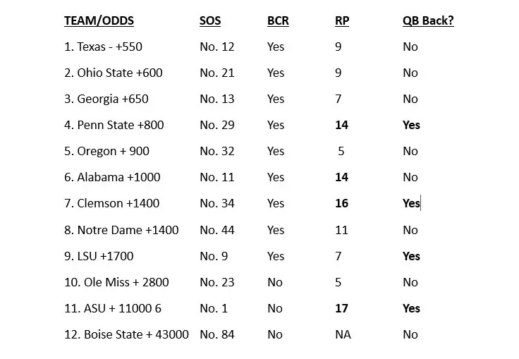 (SOS=Strength of Schedule, BCR=Blue Chip Ratio over 50%, RP=Number of Returning Players, QB Back?