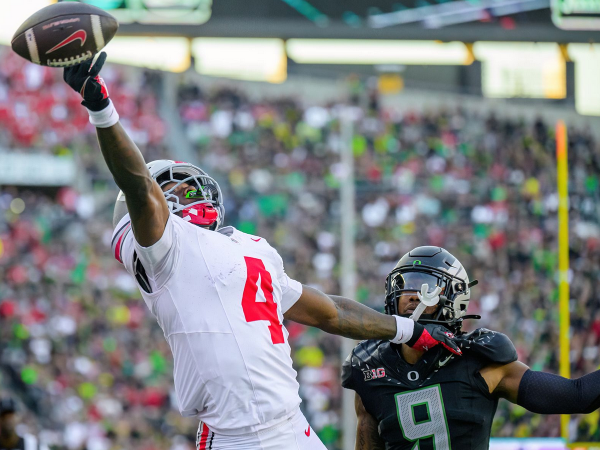Nikko Reed defends Jeremiah Smith in Autzen Stadium. (Photo By: Eric Becker)