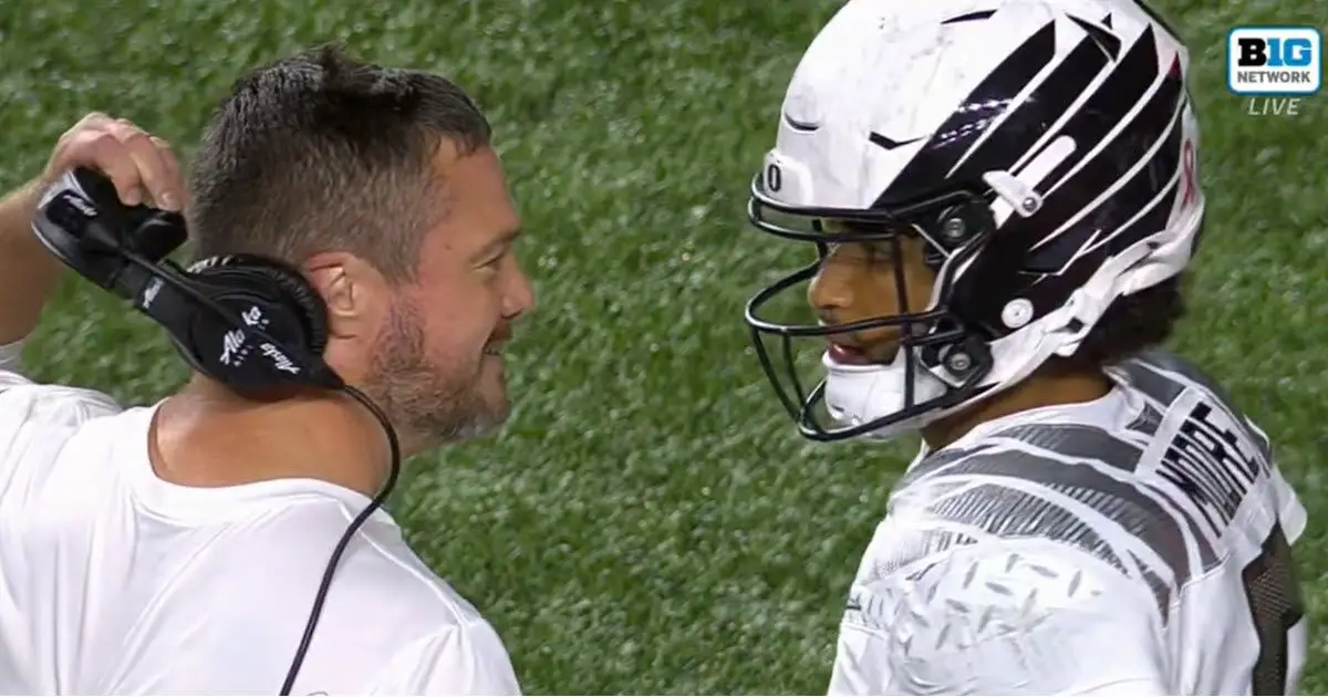 Dan Lanning and Dante Moore discuss winning it all during the blowout win at Rutgers. (Photo by B1G Network Video)