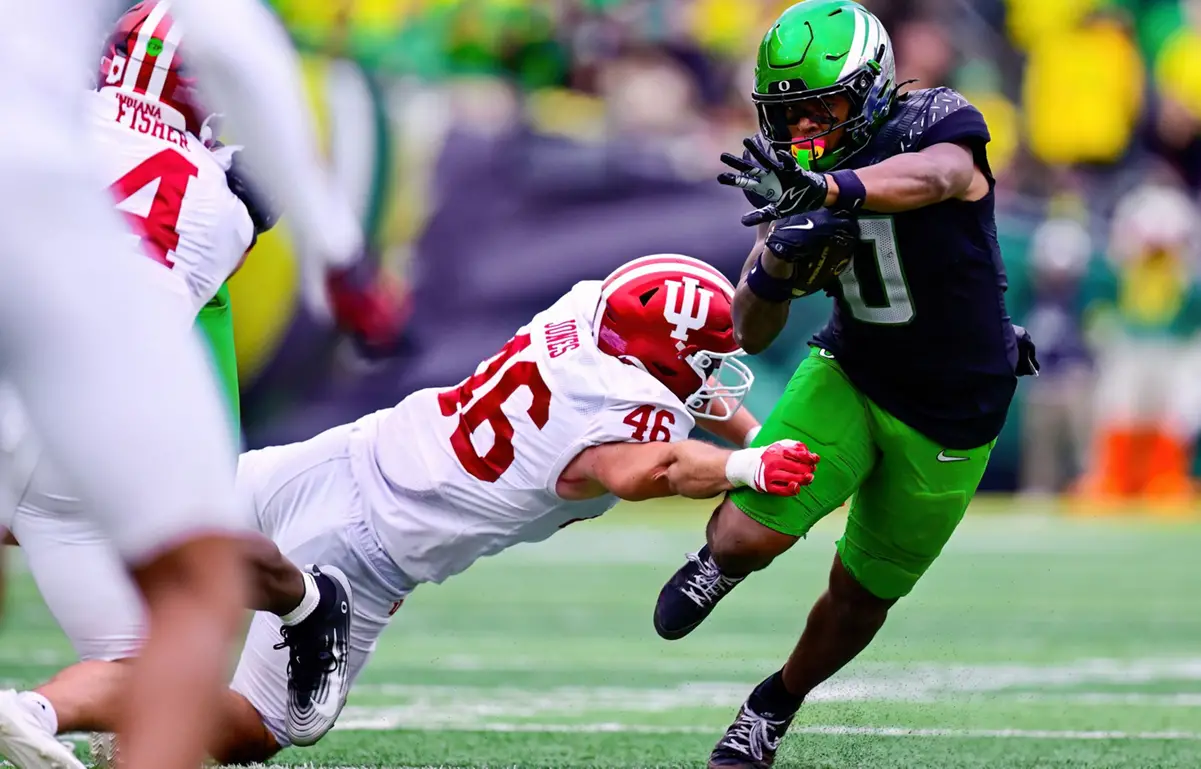 Going into last Saturday’s match-up against Indiana, the Ducks had one of the most dominant offensive lines in the country. That is no longer the case. On the very first play of the game, the Ducks gave up a sack, and the sacks kept coming. The Oregon offensive line was porous and had no answer for Indiana’s pass rush. To make matters worse, this mismatch became all the more evident with the multiple holding penalties the line committed throughout the game, because the Ducks just couldn’t block Indiana’s aggressive rush.