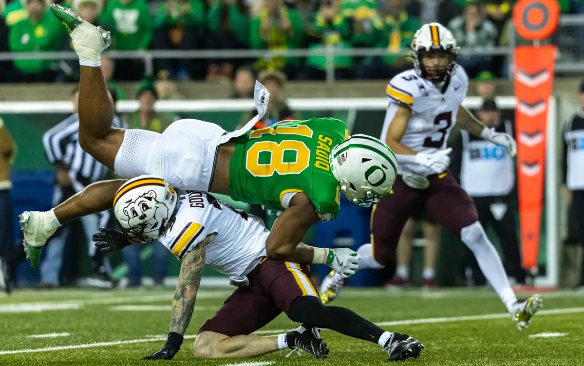 Oregon is still a very balanced team with 33 pass attempts and 30 carries but it feels like Stein is calling for more of a run game early in the game. Oregon’s reputation as a power run team forced the Golden Gophers to get sucked into defending the run, which completely opened up the vertical passing game — and in a game that lacked Oregon’s top two receivers in Dakorien Moore and Gary Bryant Jr. the Ducks turned to their tight ends.