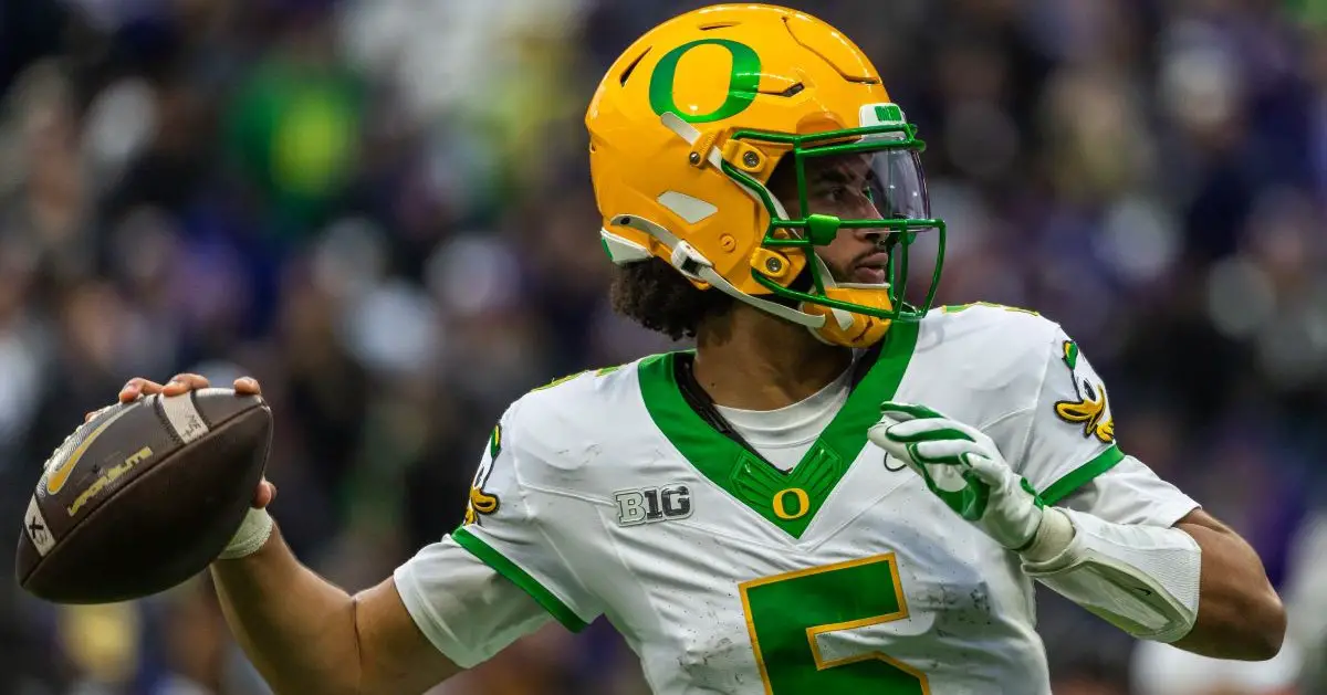 Oregon quarterback Dante Moore has guided the Ducks through an 11-1 regular season as they prepare to face James Madison in the College Football Playoff. Photo by Max Unkrich