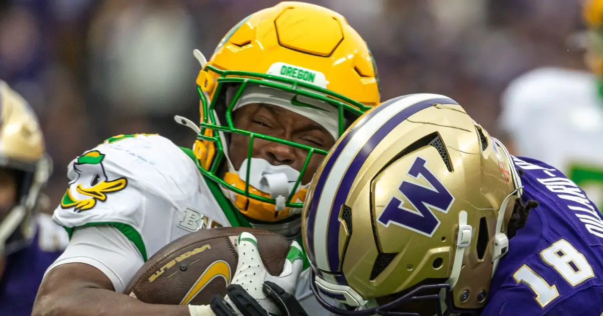 Oregon running back Noah Whittington smashes the face of a Husky defender in the final regular-season game. Photo by Max Unkrich
