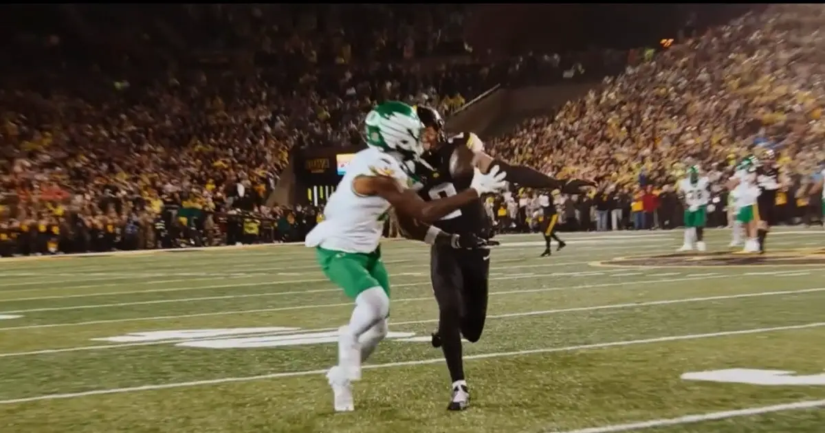The incredible pass by Dante Moore to Malik Benson vs. Iowa in 2025. (Screenshot from CBS Sports Video)