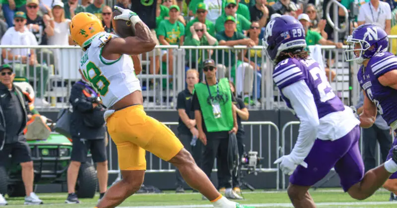 Oregon tight end Kenyon Sadiq gives a stiff arm to a USC defender en route to the end zone last Saturday in Eugene. Photo by Max Unkrich